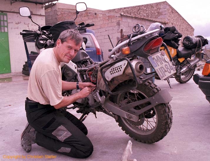 | Sardinienherbsttour 24.10 - 02.11.2003 - Teil 04: Der Nordosten - Bild 04: Grrr, Panne an Ursula`s BMW F 650. Seit gestern fliegt immer wieder mal die Sicherung raus. Wir sind bei einer fragwürdigen Autowerkstatt bei Mores gelandet und erfahren dort immerhin, dass es in Sassari eine BMW-Werkstatt geben soll. Der grimmige Blick auf dem Bild kommt daher, dass mir die Sicherung in den Luftfilterkasten gefallen ist und ich die dort nun erst mal wieder herausbekommen muss. | |