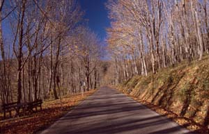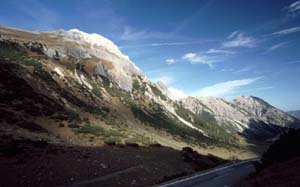Teerstraße auf fast 2000 m Höhe zu einem Parkplatz für Wanderer. Die Straße