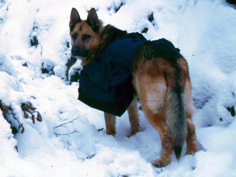 | Tour 1 vom 29.11. bis 01.12.2002 Bild 13: Hund Rocky mit Packtaschen | |